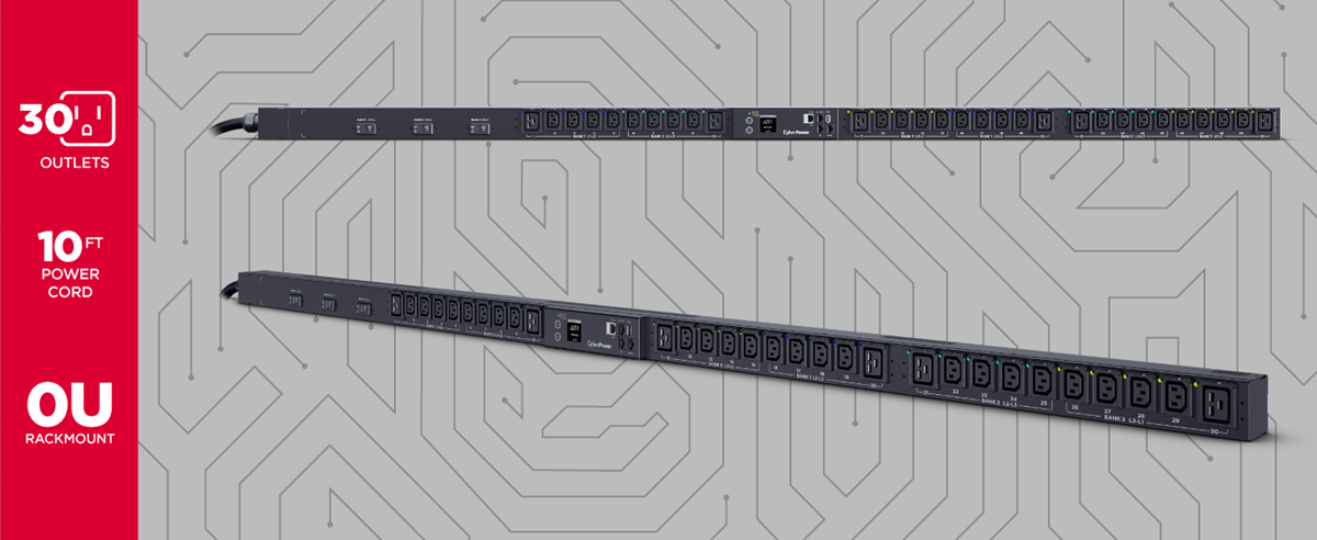 CyberPower switched metered-by-outlet PDUs provide device-level and circuit-level monitoring of input power, input frequency, load, peak load, and energy usage. They provide outlet-level monitoring of load, peak load, and energy usage.