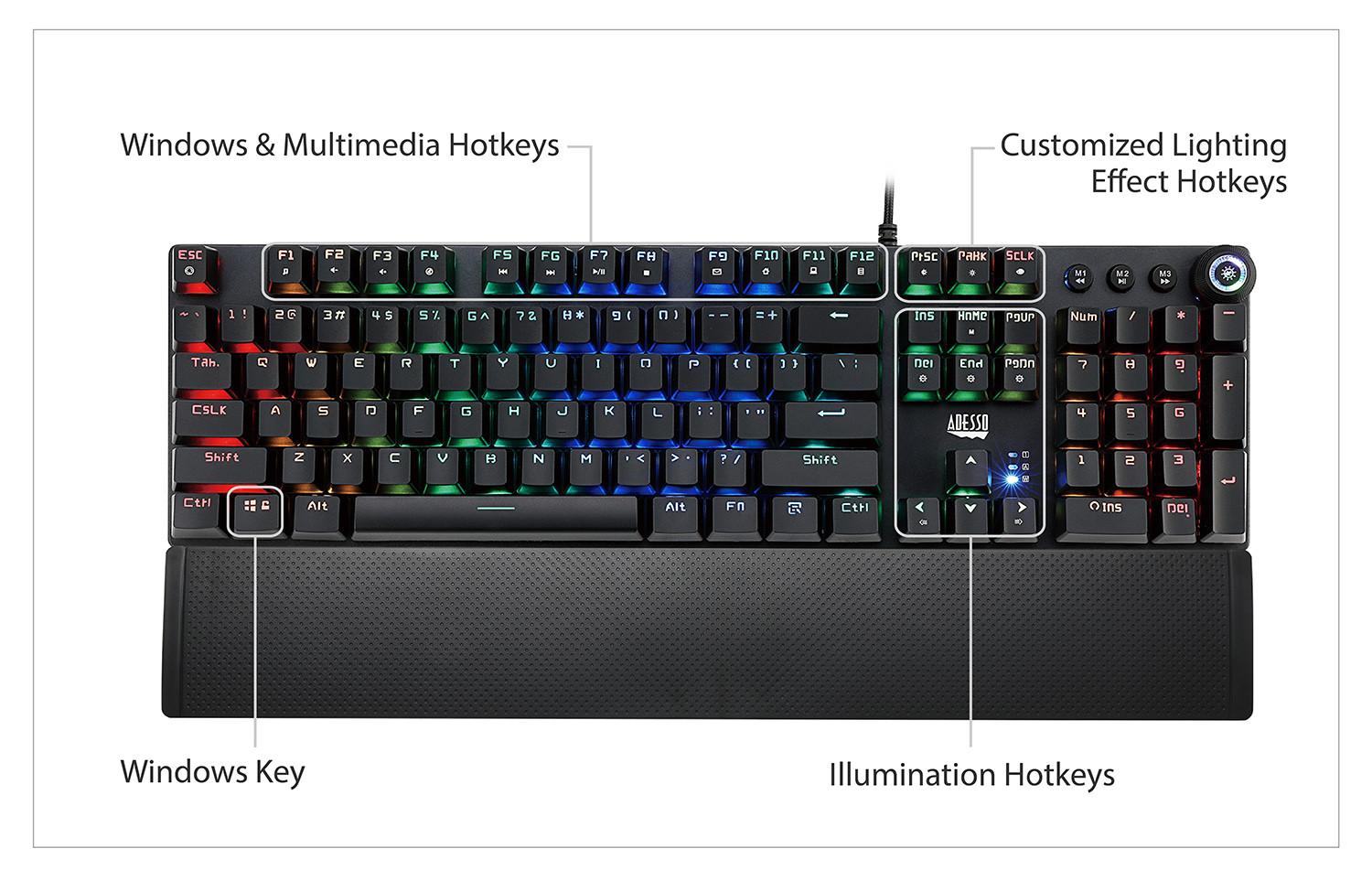 Our backlit illuminated keyboard combines Red, Green and Blue LED’s arranged like the colors in a rainbow. Onboard keystroke commands allow you to control special effects with the lighting that mirror breathing with the pulsation of the LED’s. Comes with a unique color adjustment knob, allows you to adjust the color brightness or the patterns to match your style.