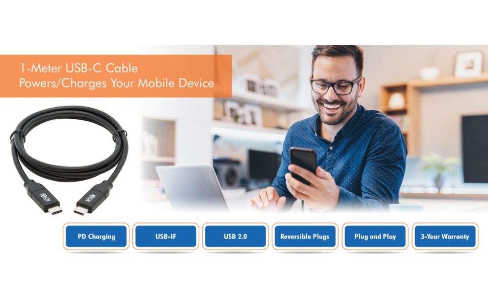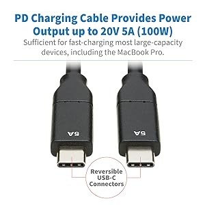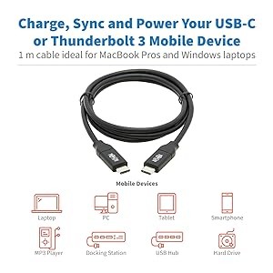 This Tripp Lite USB Type-C to Type-C cable allows you to connect one USB-C device to another. For instance, a laptop to a docking station, your smartphone to a wall charger, or an external hard drive to a computer or tablet. The one-meter cable is compatible with any device with a USB-C or Thunderbolt 3 port, including the MacBook Pro and Windows laptops.