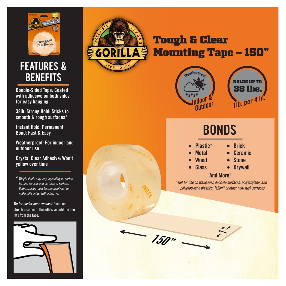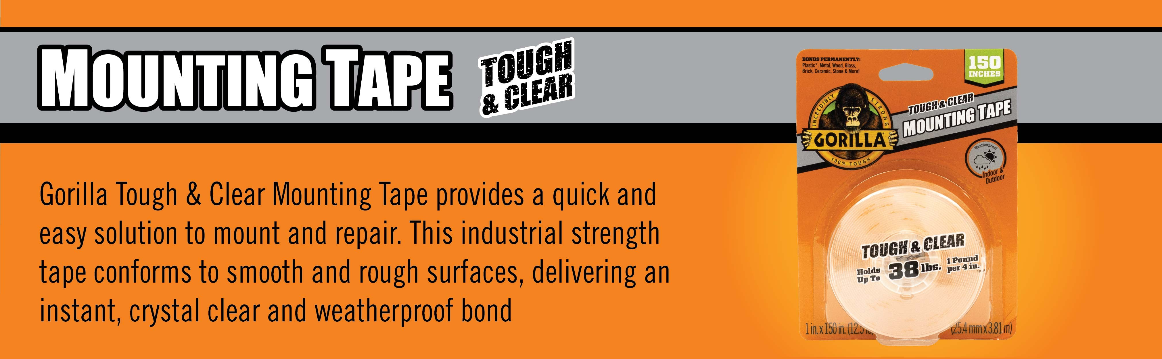 Gorilla Tough & Clear Mounting Tape is a clear double-sided tape that mounts in an instant, for a permanent, weatherproof bond. The crystal clear adhesive tape won’t yellow over time, and holds up to 15 pounds! Gorilla Tough & Clear Mounting Tape is perfect for indoor and outdoor projects and sticks to smooth and rough surfaces. Completing DIY projects is easy with this tough, double sided tape. Mount, build, and repair!