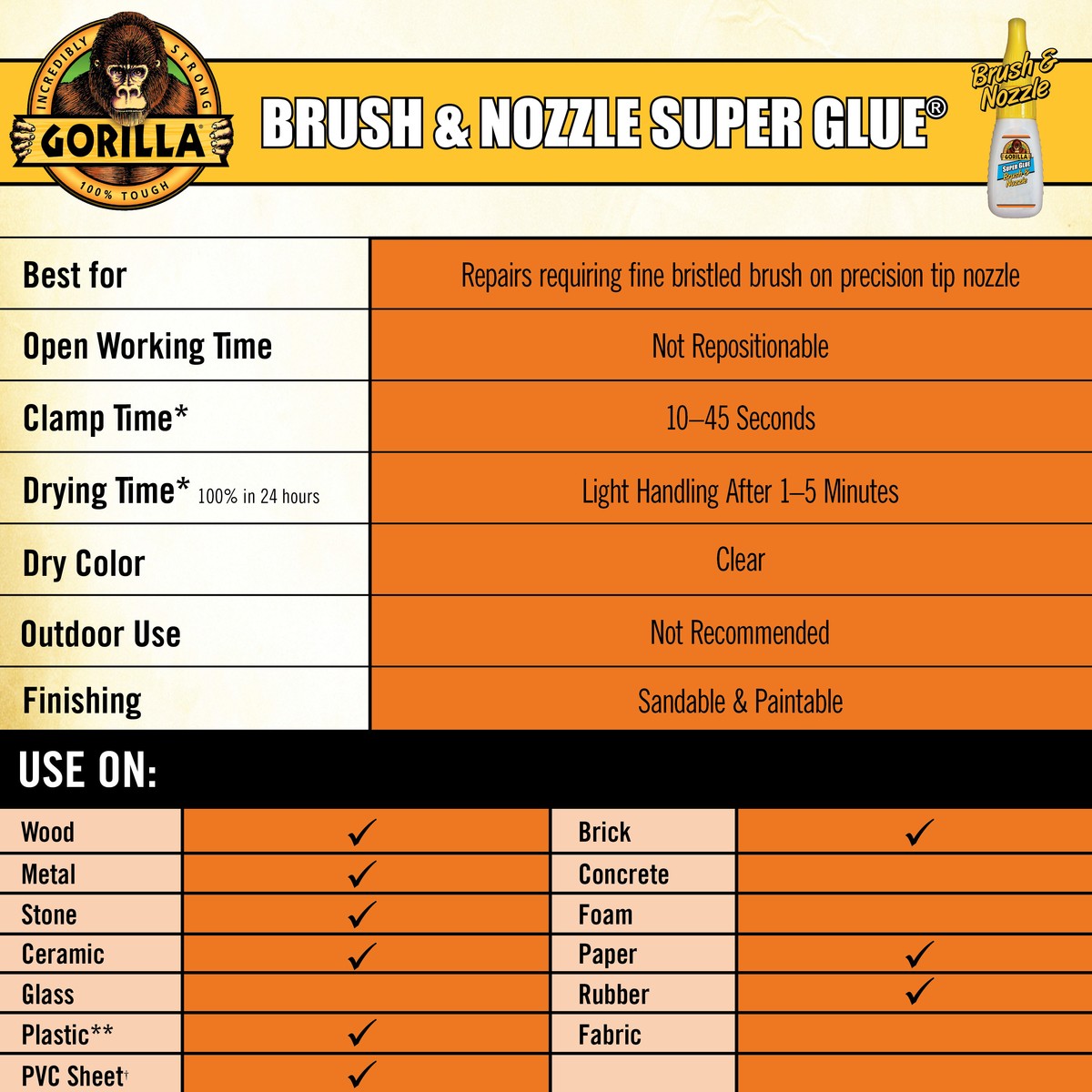 Gorilla Super Glue Brush & Nozzle offers two ways to dispense for control and versatility! The fine bristle brush offers controlled coverage with less mess and the precision tip nozzle great for quick, easy dispensing. Developed for long-lasting repairs in an instant, Gorilla Super Glue is designed with an impact-tough formula to handle bumps and drops with a strong, reliable bond.
