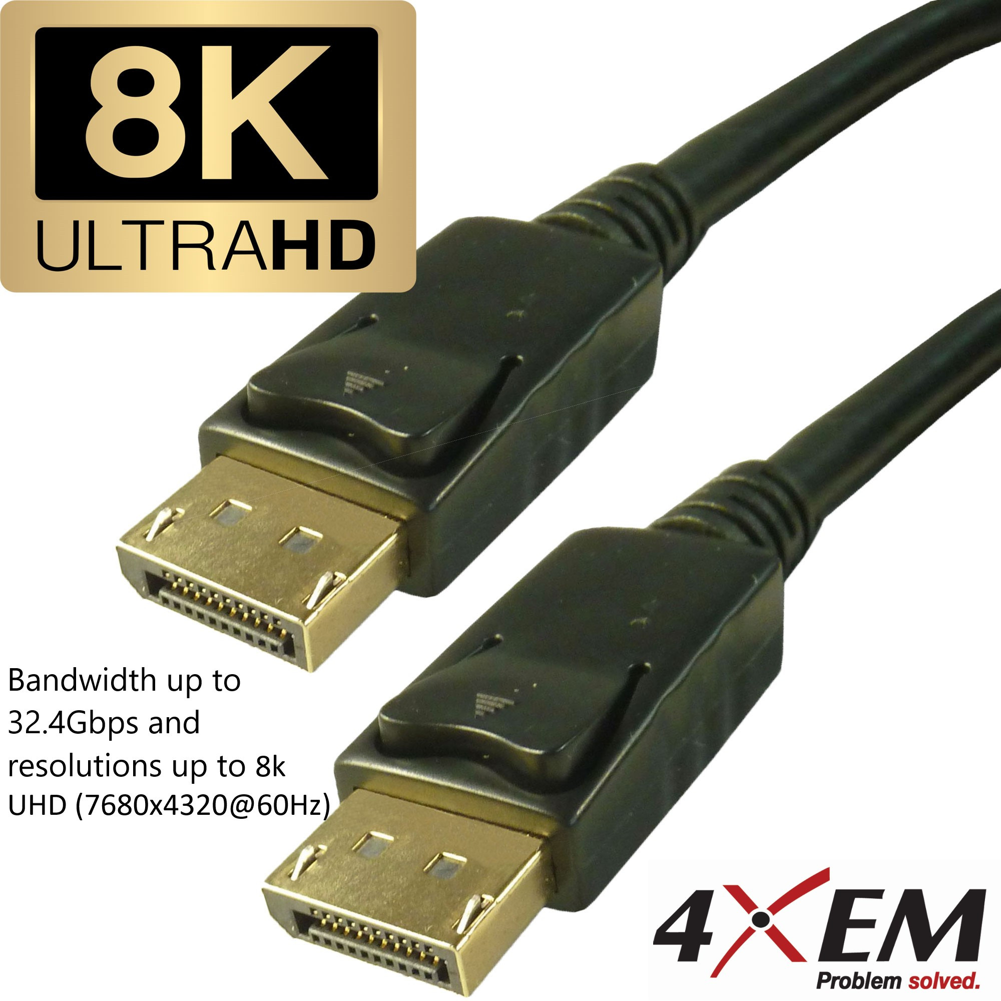 4XEM 8K Professional series DisplayPort cables support higher resolutions and faster refresh rates including 8k UHD (7680x4320@60Hz). Connect all your high quality 8K audio and video devices with the 4XEM 8K Pro Series DisplayPort cables. 4XEM Professional series DisplayPort 8K cables support the most advanced video and audio formats and highest quality. Our pro-series DisplayPort 8k cables are 1.4 but are also backwards compatible to DisplayPort 1.0/1.1/1.2/1.3 and version 1.1A