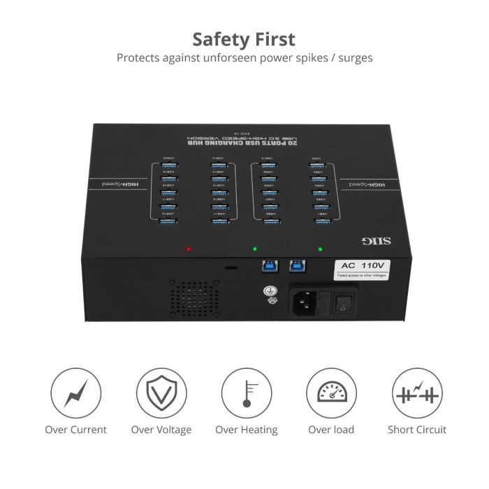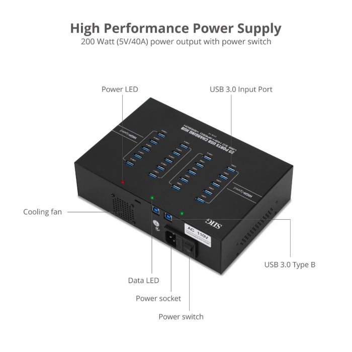 USB 3.0 data and fast charge up to 20 tablets, Smart Phones, Mobile devices, and other USB devices to your computer