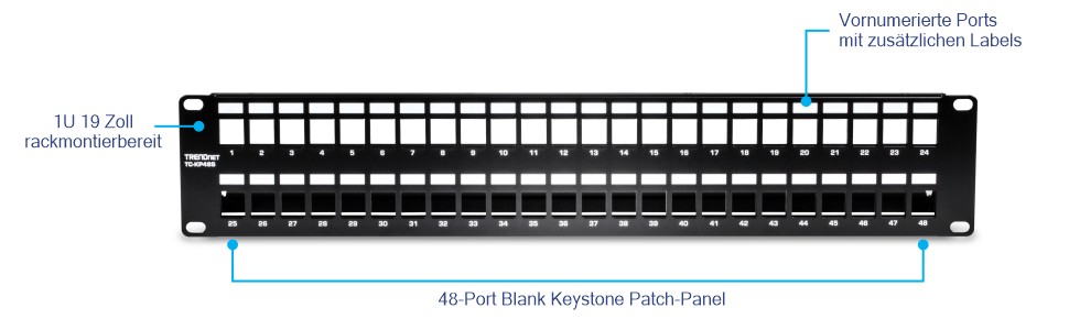 The 48-port blank 2U keystone patch panel is designed for use with TRENDnet's Cat6 keystone connectors (sold separately).