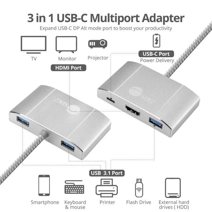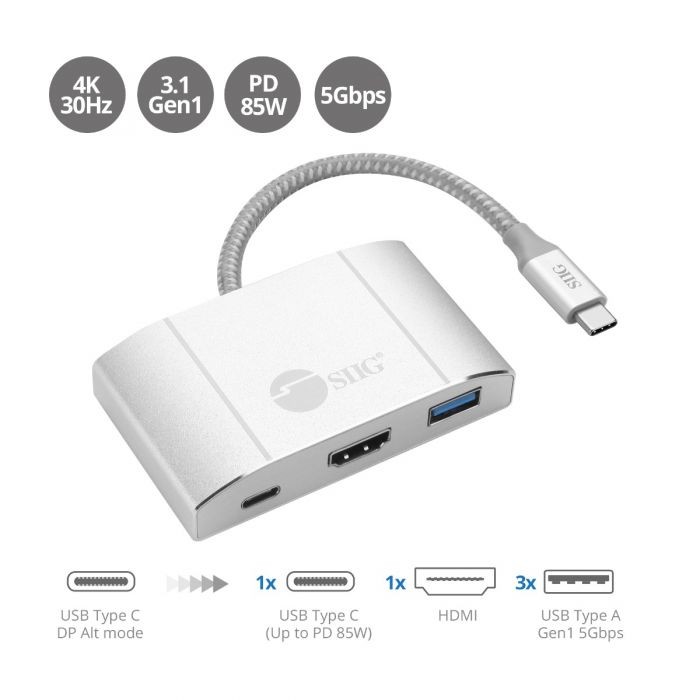 Adds one HDMI, one USB PD Type-C (USB Power Delivery) and three USB ports through one USB Type-C connection