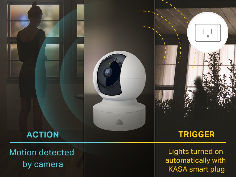 Create interactions with your plug and other Kasa products. Connect a lamp to your plug so that when your camera detects motion, your light turns on.
