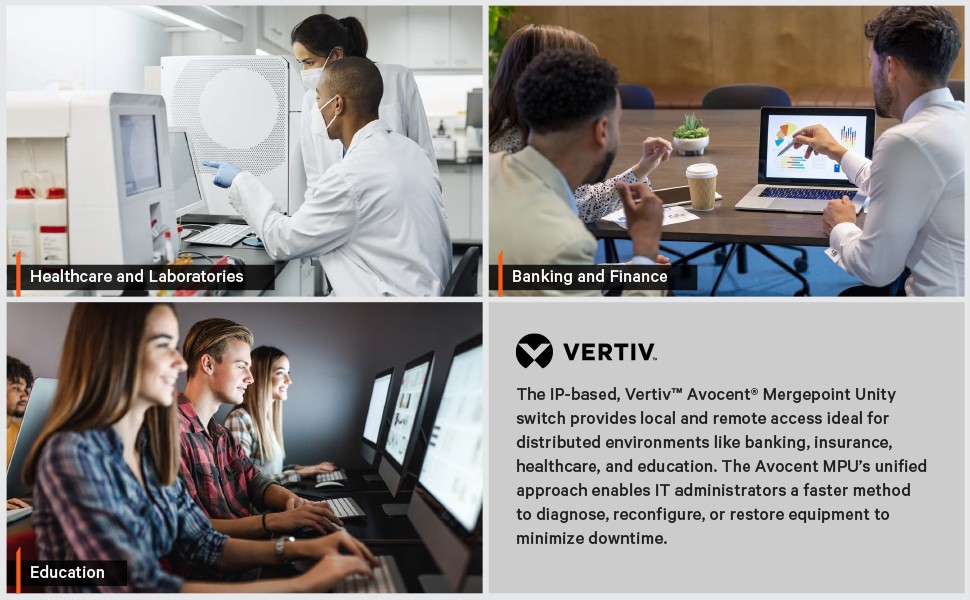 Avocent MPU KVM Switches reduce the time required to remotely diagnose, reconfigure, repair, or restore servers as well as network devices and other hardware with serial configuration and/or management consoles. Complementing in-band tools create a more complete remote management solution to access servers and network equipment at remote locations. Additionally, the switches are compatible with Vertiv Avocent DSView 4.5 management software.