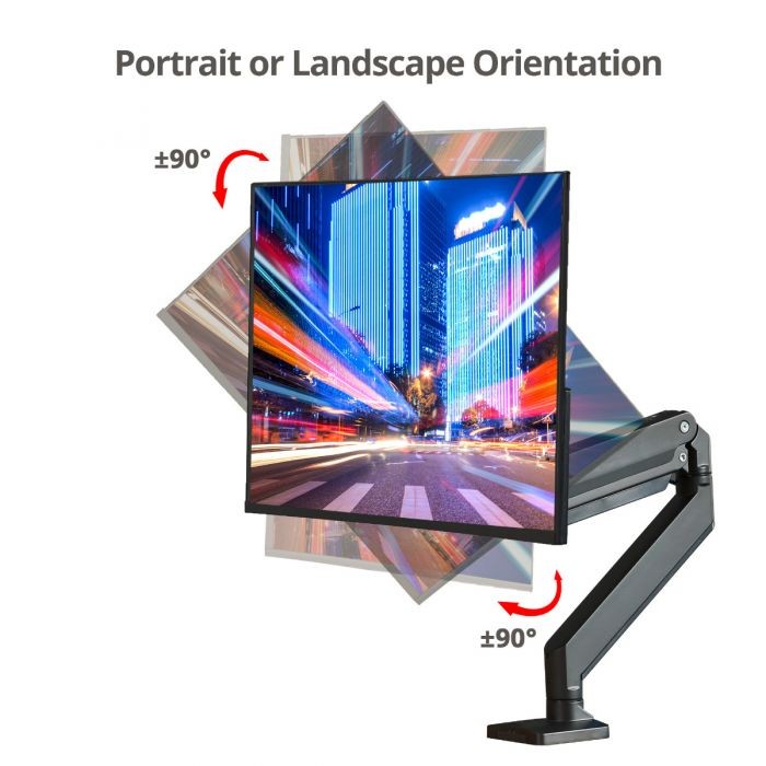 Gas spring assisted full-motion (tilt, swivel, rotate, and height adjustment) articulating single monitor desk mount