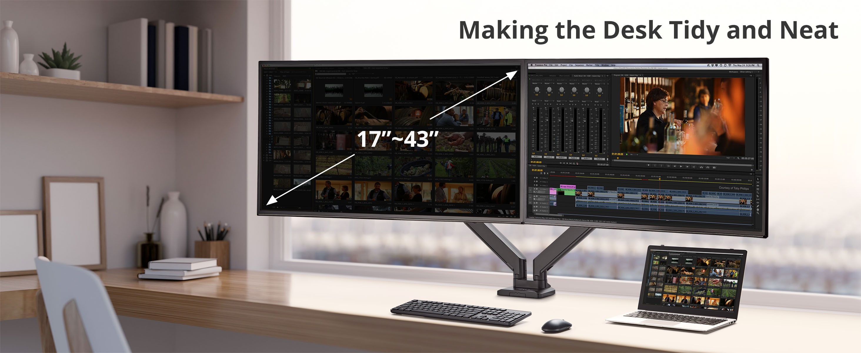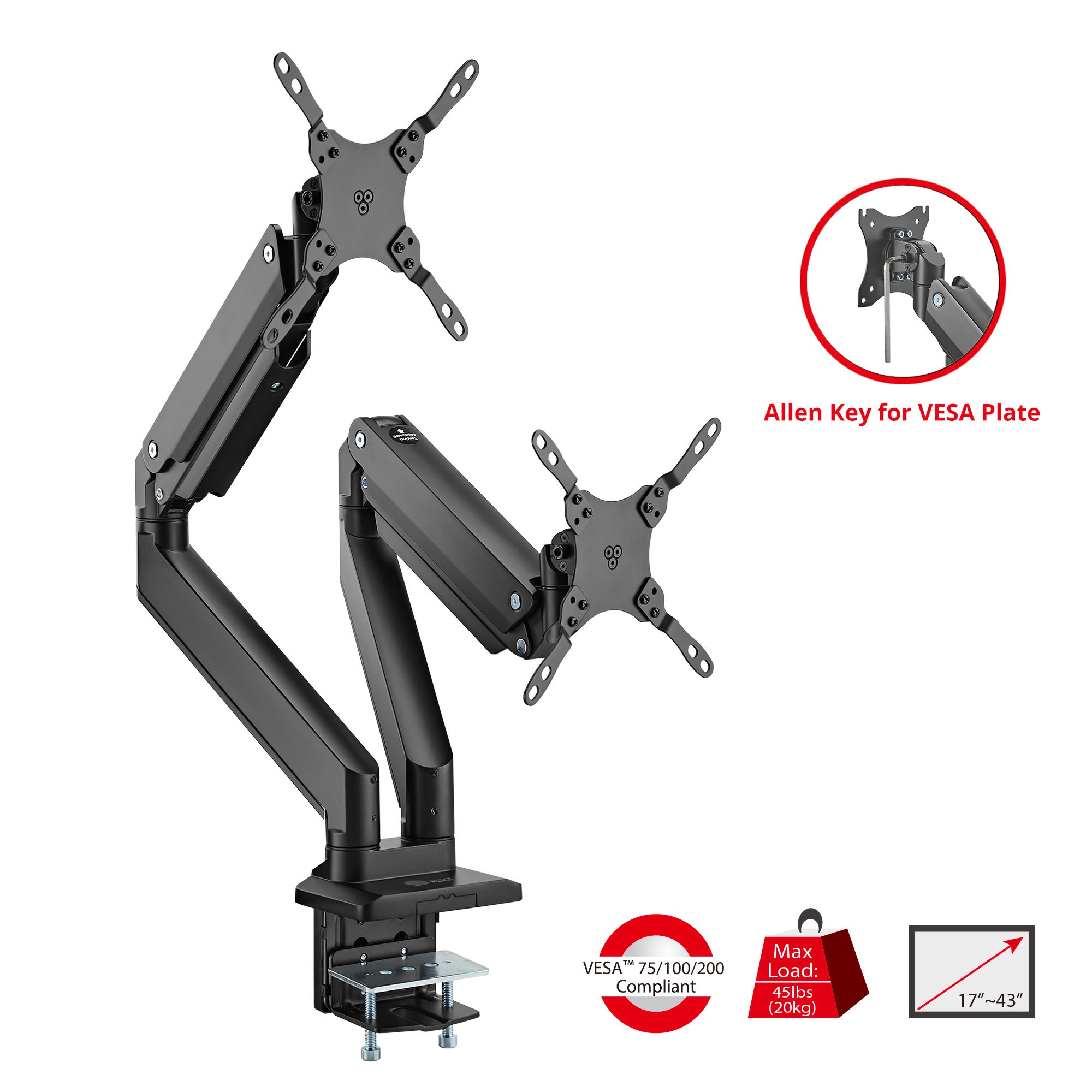 Dual Monitor Heavy-Duty Premium Aluminum Gas Spring Desk Mount - up to 43", Max Load 45 Ibs, fits Two Flat/Curved Monitor, Full Motion Height Swivel Tilt Rotation Adjustable Monitor Arm, VESA 75x75, 100x100, 200x200, C-Clamp/Grommet/Cable Management