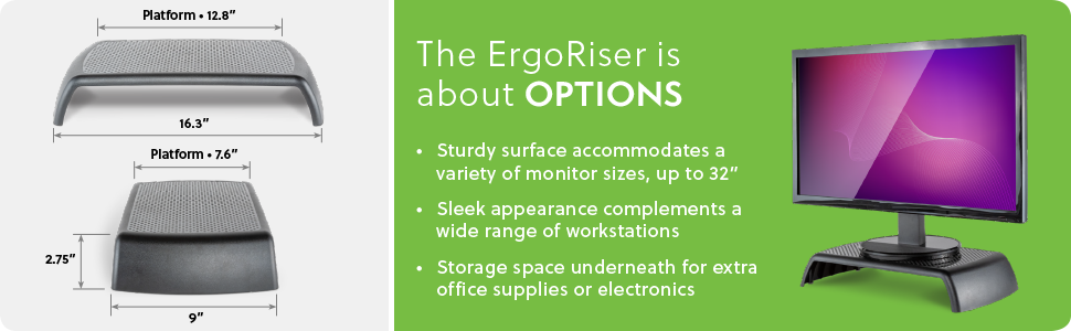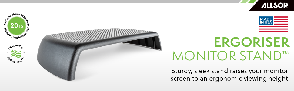 The most affordable and attractive Made in the USA monitor stand offered today, the ErgoRiser Monitor Stand™ raises your monitor or laptop 2.75” to a comfortable ergonomic viewing height. This small and compact stand can support up to 20lbs and features a sleek micro-texture finish that complements any office. The ErgoRiser also creates extra storage under the monitor for a compact keyboard, tablet, or extra office supplies. Non-skid protective feet prevent sliding and protect your desk surface.