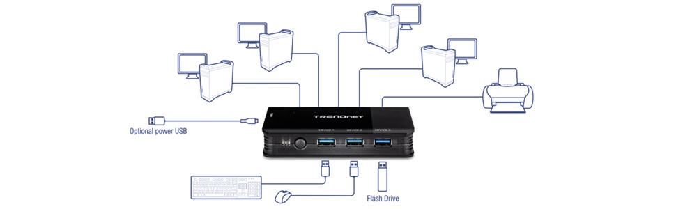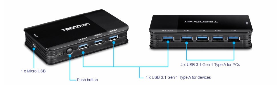 TRENDnet's Multi-Computer 4-Port USB 3.1 Sharing Switches each feature a switchable 4-port USB 3.1 hub that you can share between multiple computers. These USB switches are easy to install – simply plug in your mouse, keyboard, flash drives, or scanners, and then share those devices with multiple computers. The 4-port USB 3.1 share switches support a wide variety of USB peripherals with USB 3.0, 2.0, and 1.1 backwards compatibility.