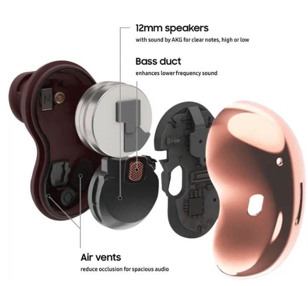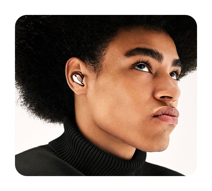 Feel like you're in the front row, or part of something bigger. 12mm speakers with sound by AKG work together with Galaxy Buds Live's ergonomic design to deliver spacious sound, while the large driver and bass duct help emit deep bass with air flow that lets sound flow seamlessly.