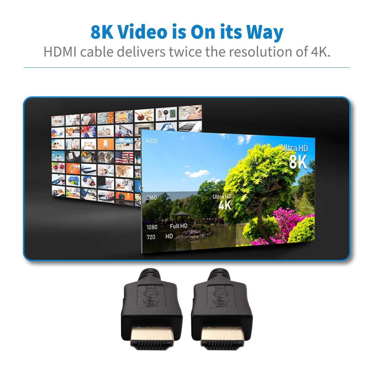 Tripp Lite’s P568-010-8K6 8K HDMI Cable allows your HDMI source to deliver video with audio to your HDMI display at resolutions up to 8K x 4K @ 60 Hz. It’s backward compatible with all HDMI devices, including Blu-ray™players, game towers and 4K TVs, so it’s perfect for future-proofing your high-definition or UHD audio/video application in anticipation of an 8K upgrade. With no software required for installation, this 10 ft. cable is completely plug-and-play.