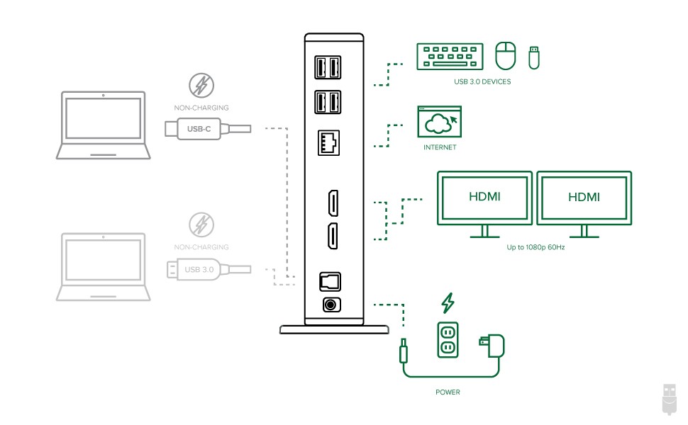 Designed for those who want a one-stop upgrade for your USB 3.0 or USB-C laptop. The Plugable USB 3.0 Dual HDMI Laptop Docking Station for Windows, Mac, and ChromeOS (UD-3900Z) allows you to add dual HDMI monitors, and connect your peripherals, all through a single cable back to your laptop. Quickly come and go from your desk with ease. By connecting one cable to your laptop, you gain 10 extra ports of connectivity, making it easier to do more work in less time.
