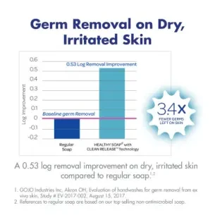 - A 0.53 log germ removal improvement on dry, irritated skin compared to regular soap - 3.4X fewer germs left on skin