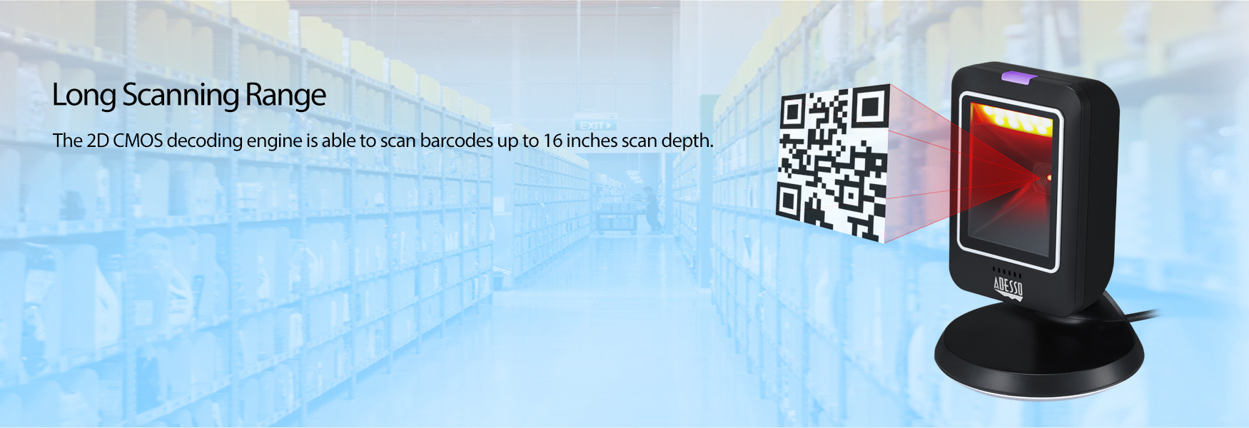 The 2D CMOS decoding engine is able to scan barcodes up to 16 inches scan depth.