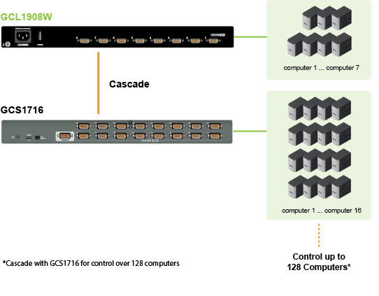 A single GCL1908WKITU can control up to eight (8) computers, but as many as two (2) additional compatible KVM switches can also be cascaded to reach up to 128 computers* controlled from a single keyboard, monitor and mouse console.