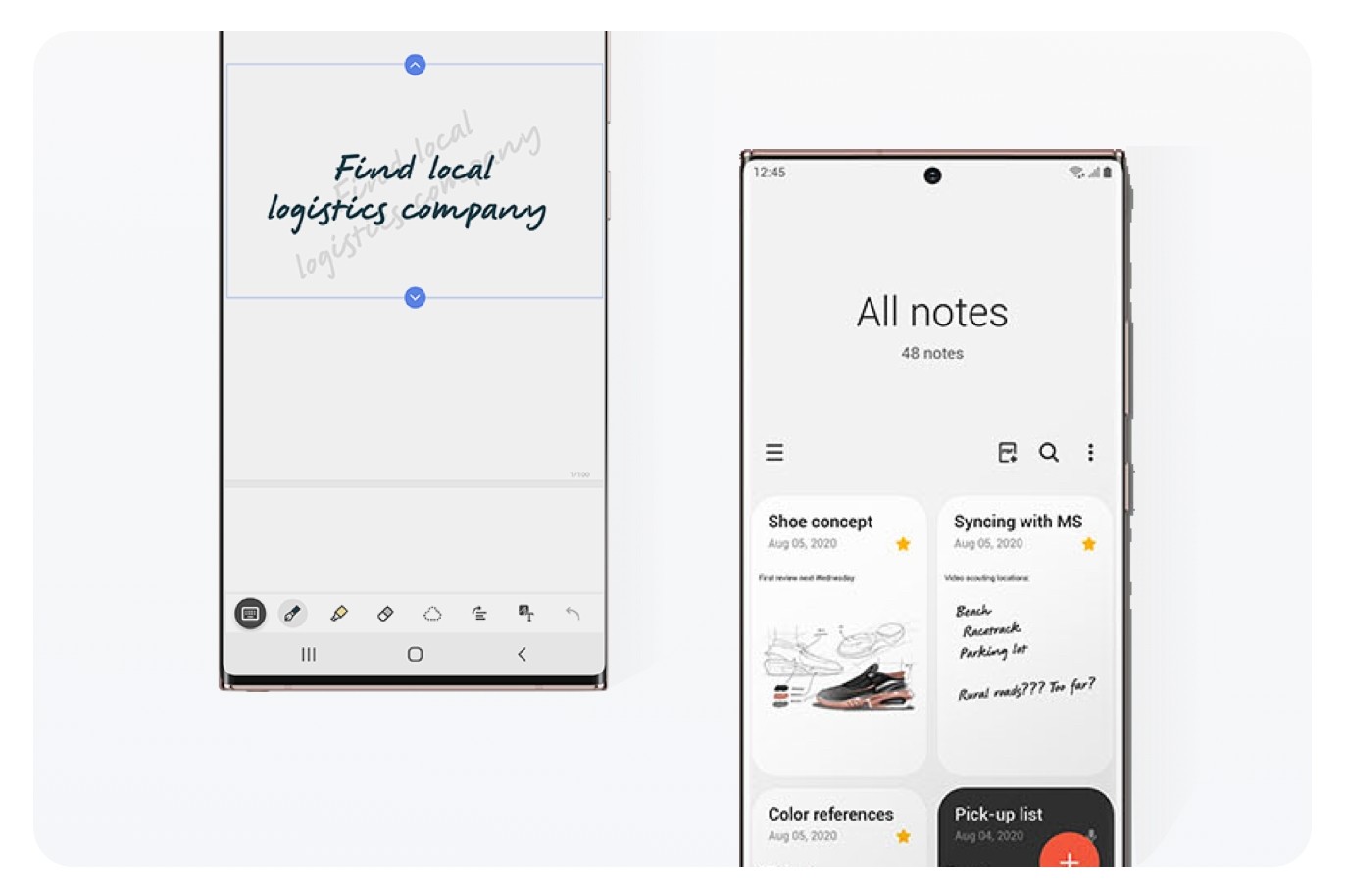 The more intelligent Samsung Notes helps you create professional documents while out of office. Sketch your thoughts and ideas, then convert them into Microsoft Word or PowerPoint. Import a PDF file and add your comments. Then save your notes and sync them across your Galaxy phone and tablet.