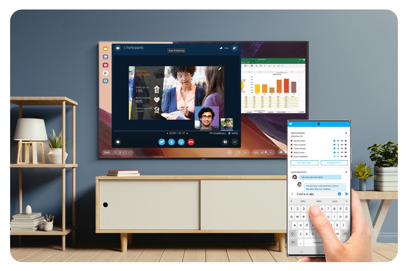 Transform working from home by working on your biggest screen. In Samsung DeX mode,3 you can use the processing power of the Galaxy Note20 Ultra 5G combined with a mouse and keyboard to work seamlessly on your TV wirelessly,8 while checking texts or taking conference calls, all the while multi-tasking on your phone.