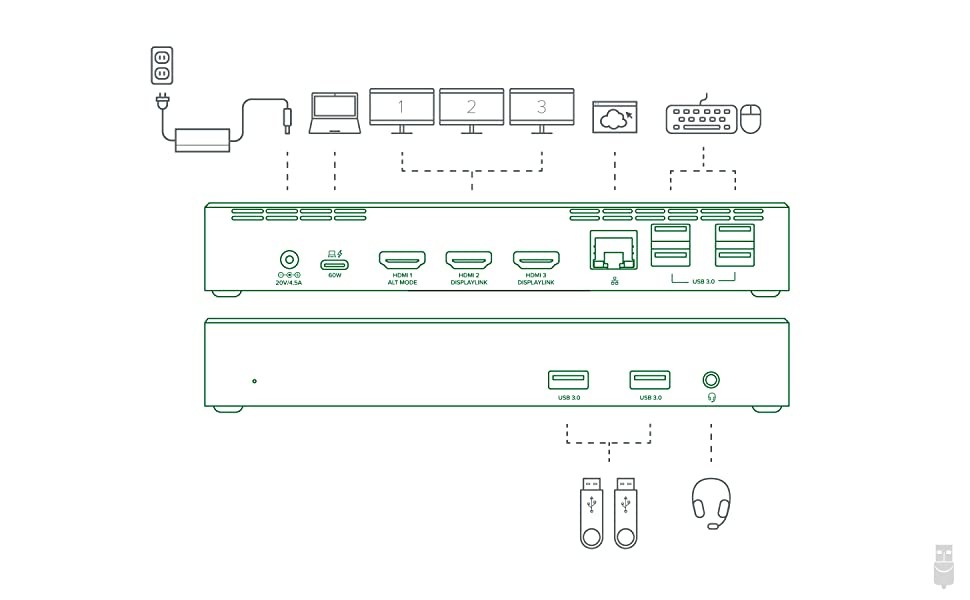 DisplayLink is a technology that allows compressed data of various types to be sent over USB data connections. The DisplayLink DL-3900 chipset in this docking station connects all the data and video connections, other than the "4K" HDMI 1.4 connection, on this dock.