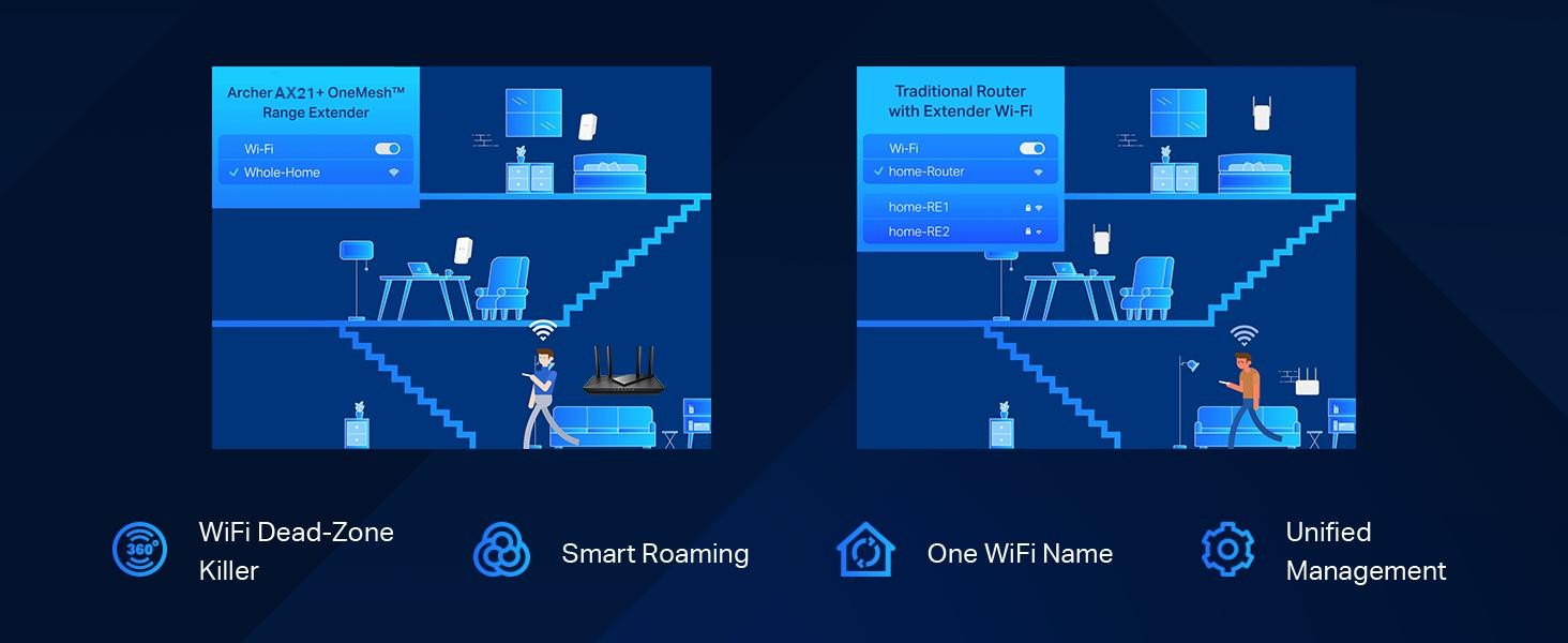 OneMesh uses your compatible router and range extender to form a mesh WiFi network. This allows you to roam freely without connecting to a new network or dropping your connection and only requires one name and password to connect.[7][9]