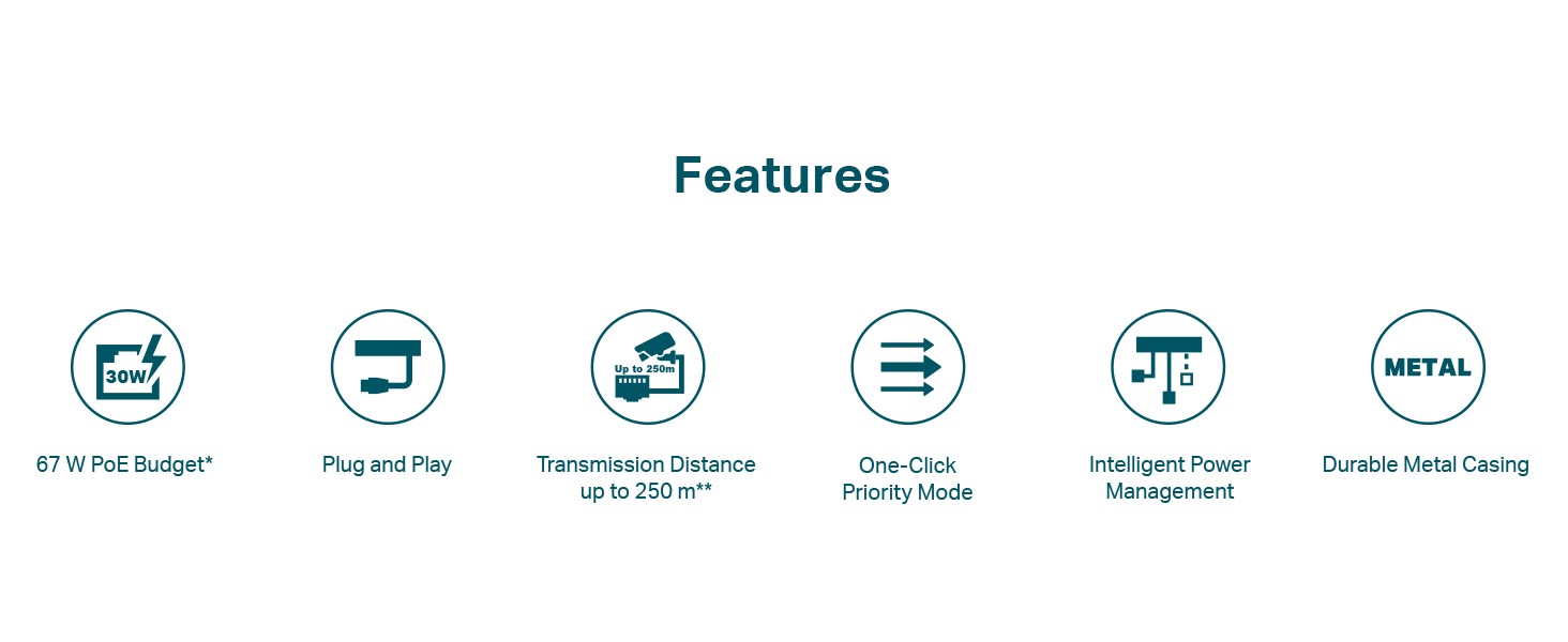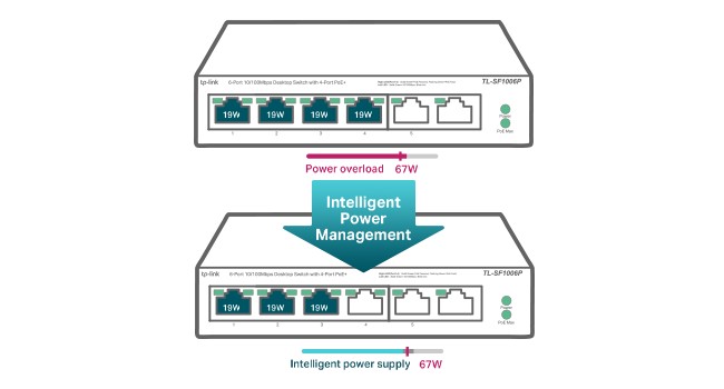 When total power consumption exceeds 67W, the intelligent power management will turn off the lower priority port power to ensure the high priority port's power supply and protect the device from power overload. It also protects your PoE and non-PoE equipment from being damaged.