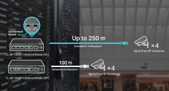 With extend mode, the PoE transmission distance reaches up to 250 m—perfect for IP Camera deployment in large areas.