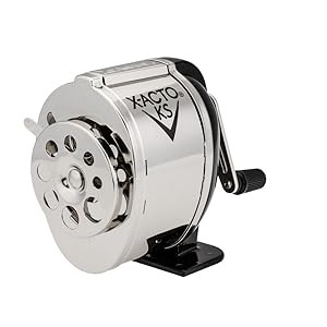 The X-ACTO KS Manual Pencil Sharpener is designed specifically to stand up to regular and continuous use in high-traffic classroom environments. A die-cast metal base provides rugged stability, while a nickel-plated shavings receptacle withstands years of use.