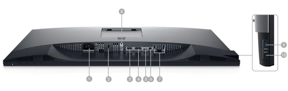 1. AC power port | 2. Security lock slot | 3. HDMI port | 4. DP port | 5. USB-C/DisplayPort | 6. Audio line-out port | 7. USB downstream ports (2) | 8. Stand lock | 9. USB downstream port | 10. USB-C downstream port