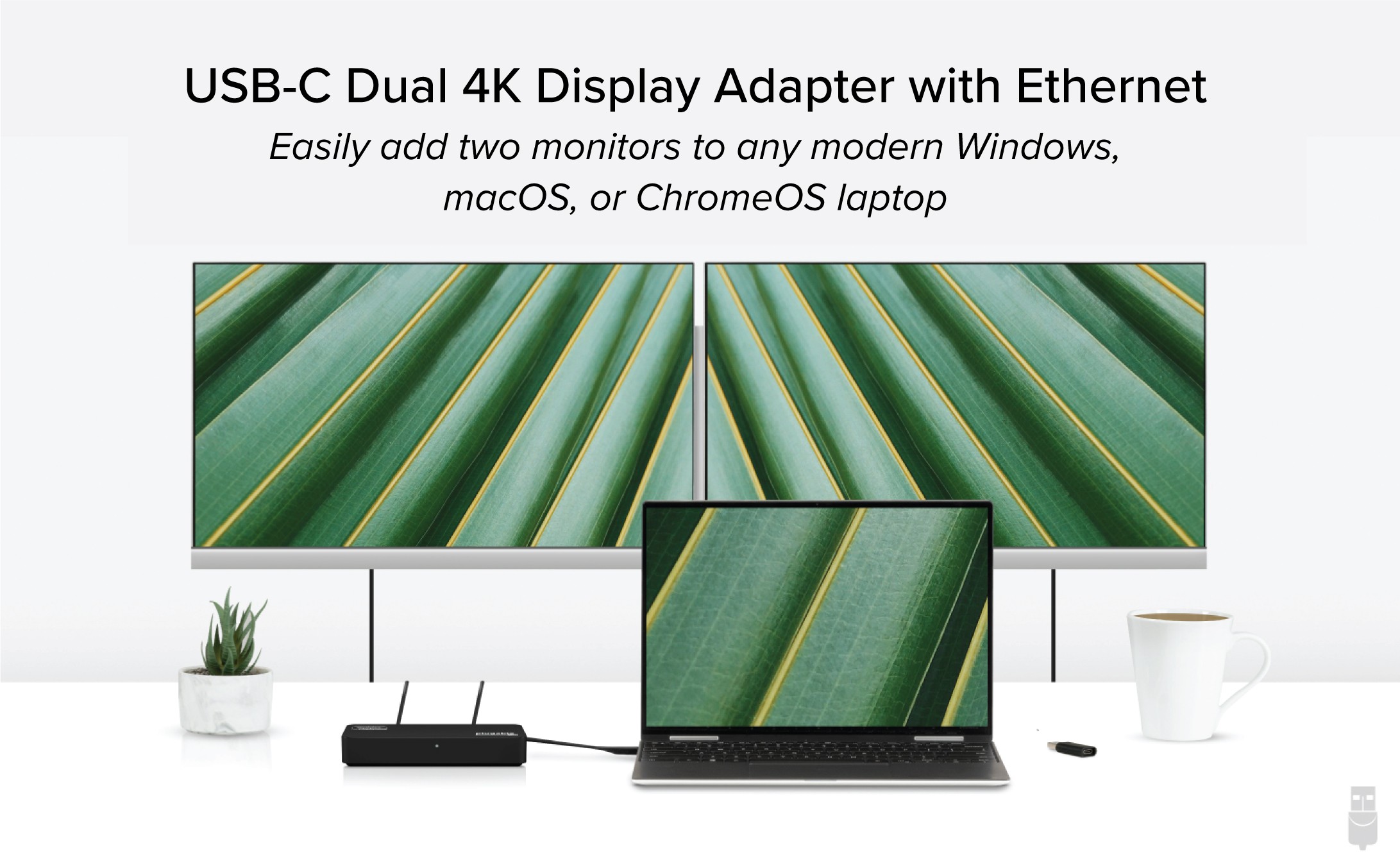 Quickly and easily add 2 Ultra HD/4K monitors to your USB 3.0, USB-C, or Thunderbolt 3 laptop or desktop with the Plugable USB 3.0 and USB-C Dual 4K Display Adapter with Ethernet (USBC-6950UE).