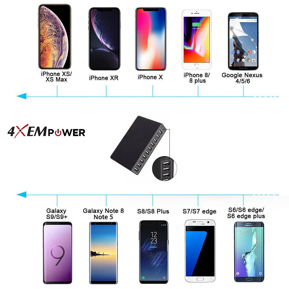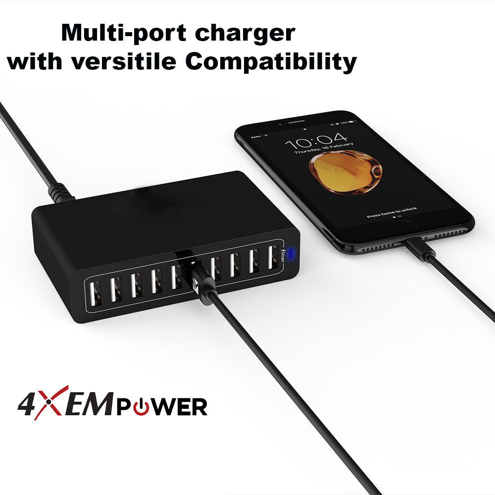 4XEM’s 50W 10-Port Charger provides 10 USB ports to simultaneously charge up to 10 devices.