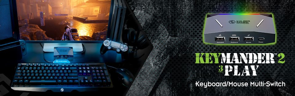 The KeyMander® 2 3Play™ from Kaliber Gaming by IOGEAR is a keyboard/mouse sharing switch for PC and game consoles, that allows gamers to share their keyboard and mouse between any (3) three of the following devices, PC, Xbox One, Xbox 360, PS3®, PS4®, or Nintendo® Switch. Use your keyboard and mouse skills to dominate all your favorite First-Person Shooter (FPS), Role Playing Games (RPG) and Real-Time Strategy (RTS) games. Playing on a console has never been this much fun!