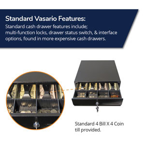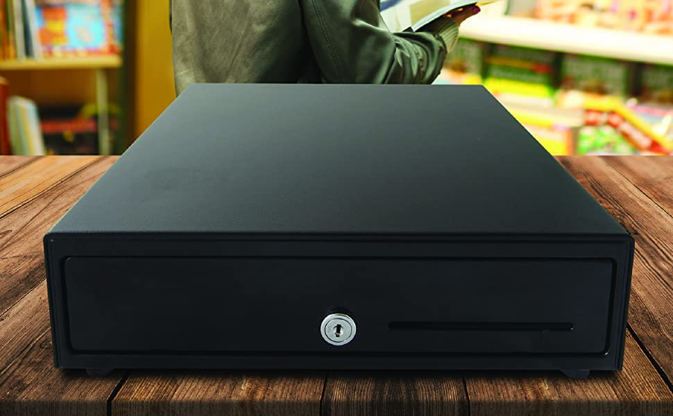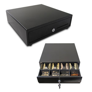 The all-black drawer comes with a plastic till that has four bill compartments and four coin compartments. Finished with one media slot for inserting checks, credit card receipts, or other transaction papers.