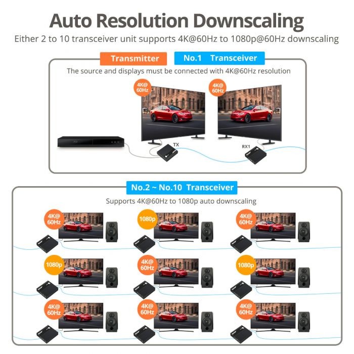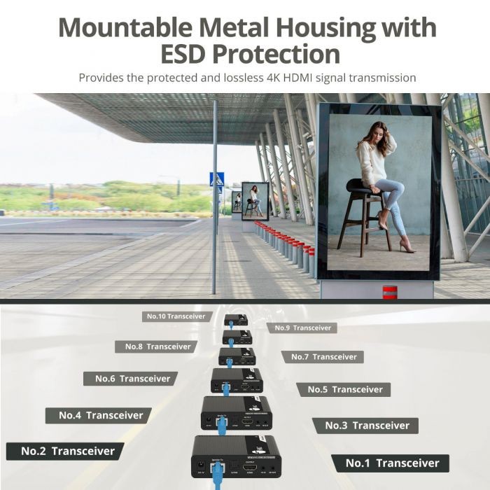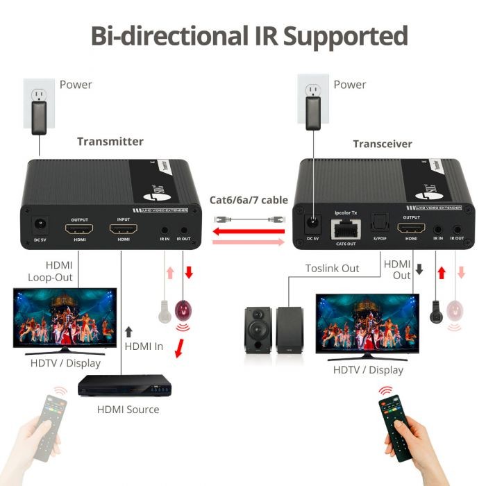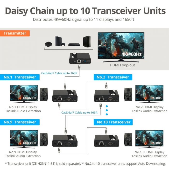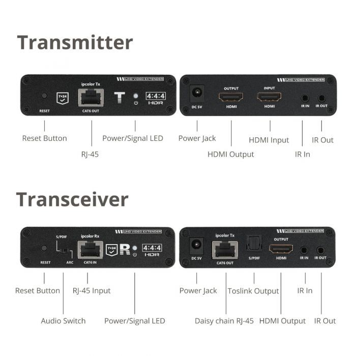 Extends 4K@60Hz HDMI signals up to 230ft with zero latency, IR, HDR, audio extraction, local HDMI out, and ARC using industry leading ipcolor video transmission technology; supports daisy chaining of additional Transceivers, part# CE-H26N11-S1, sold separately, for additional extension and displays