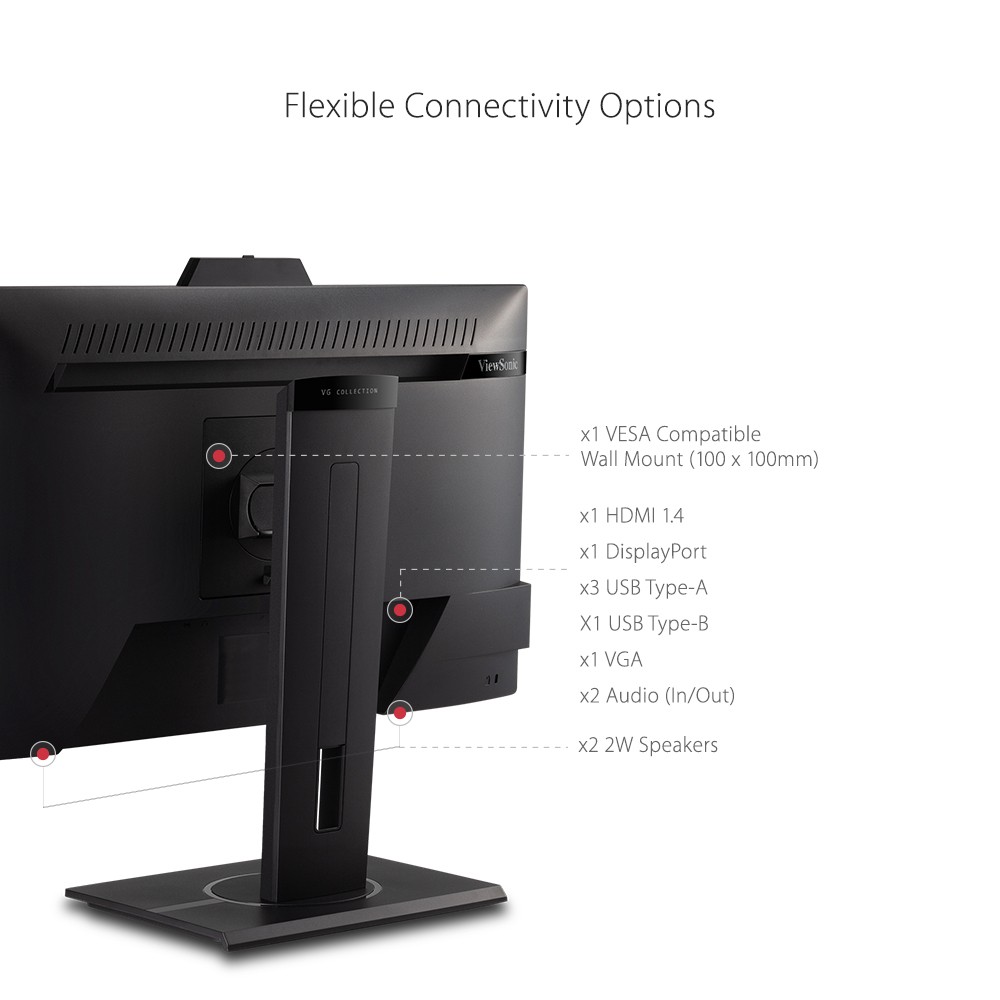 Featuring a built-in 2MP camera, the ViewSonic ® VG2440V monitor is perfect for collaboration and video conferencing right from your desktop. The integrated camera captures high-definition video and features 5-degree adjustability so you can find the perfect angle for your video conference. The camera also features a privacy shutter that ensures the camera is on only when you want it to be on. An integrated microphone and speakers round out the full video conferencing capabilities of this monitor. The 24” (23.8” viewable) monitor itself features a Full HD SuperClear ® IPS panel for vivid visuals, and a full ergonomic stand for comfort and productivity. Integrated HDMI, DisplayPort and VGA ports make it easy to connect whether you are set up at home or at the office.