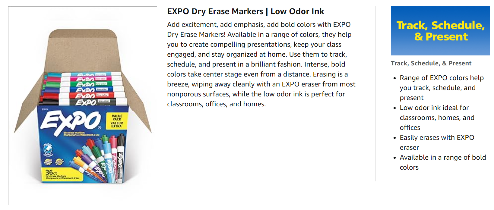 With specially formulated low odor ink, EXPO dry erase markers are perfect for the office, classroom, or home.