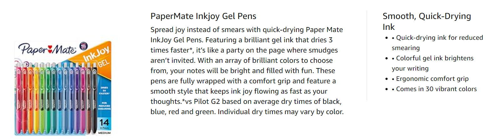 Dries Up to 3x FasterPaper Mate InkJoy pens feature smooth gel ink that dries 3 times faster*! With the fast-drying ink, you can focus on your thoughts and forget about smudges.*vs Pilot G2 based on average dry times of black, blue, red and green. Individual dry times may vary by color. |