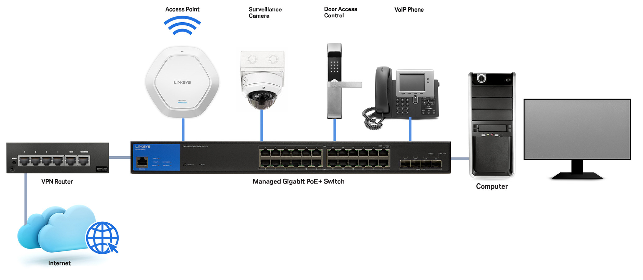 Linksys Managed Gigabit PoE+ switches can power PoE+ enabled devices such as surveillance cameras, access points, door access control systems, VoIP phones and ProAV systems. This will eliminate the need for additional power cables and outlets, making installation simpler and less expensive.