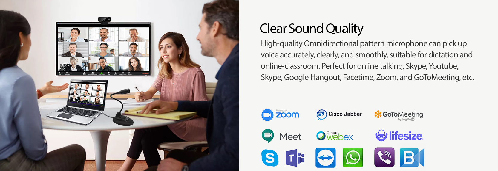 High-quality omnidirectional condenser microphone can pick voice up accurately and clearly. The microphone is suitable for dictation, online-classrooms, video conferencing and streaming. The microphone is compatible with most video conferencing applications such as Zoom, Skype, Webex, GoToMeeting, Google Meet, Microsoft Teams and many more.