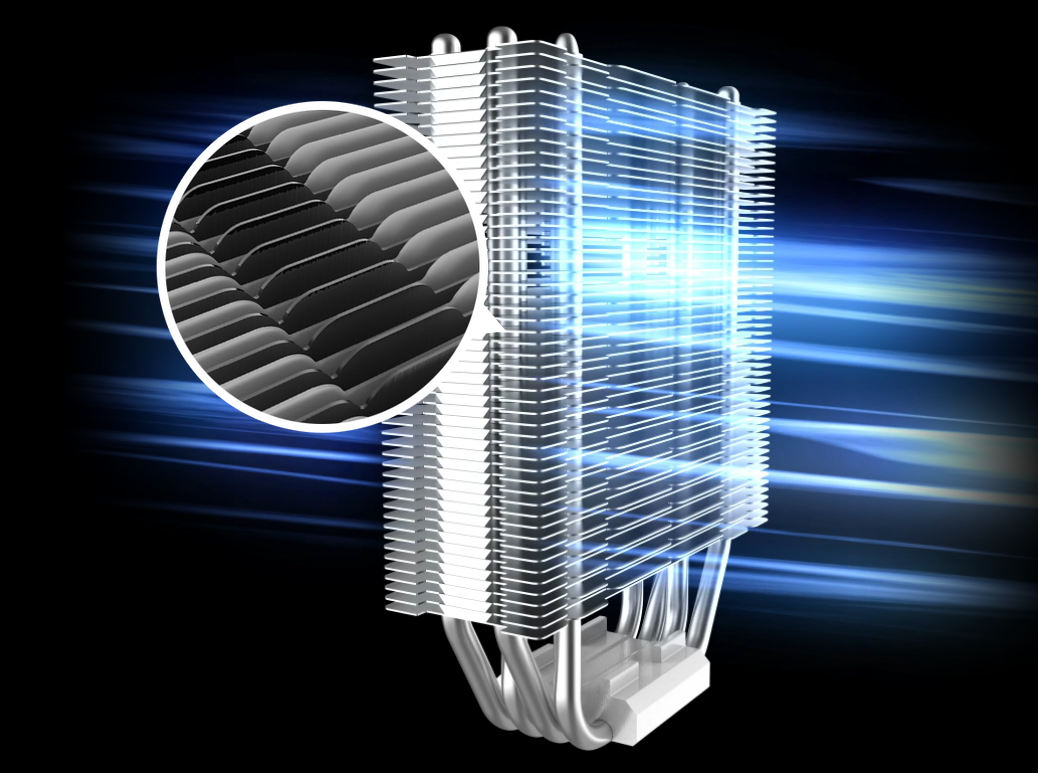 The fin is designed with an asymmetric structure that allows larger air intake through the fins. This design lowers the air turbulence and straightens out the airflow making it easier to disperse heat from the fins, delivering superb cooling performance.
