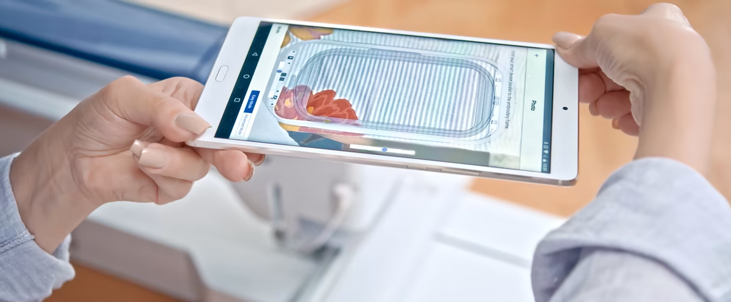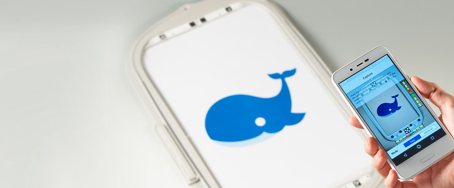 Take a picture of your hooped fabric with your mobile device. The captured background is transferred to the machine through your wireless network so you can easily position and colorize your design on the LCD display.