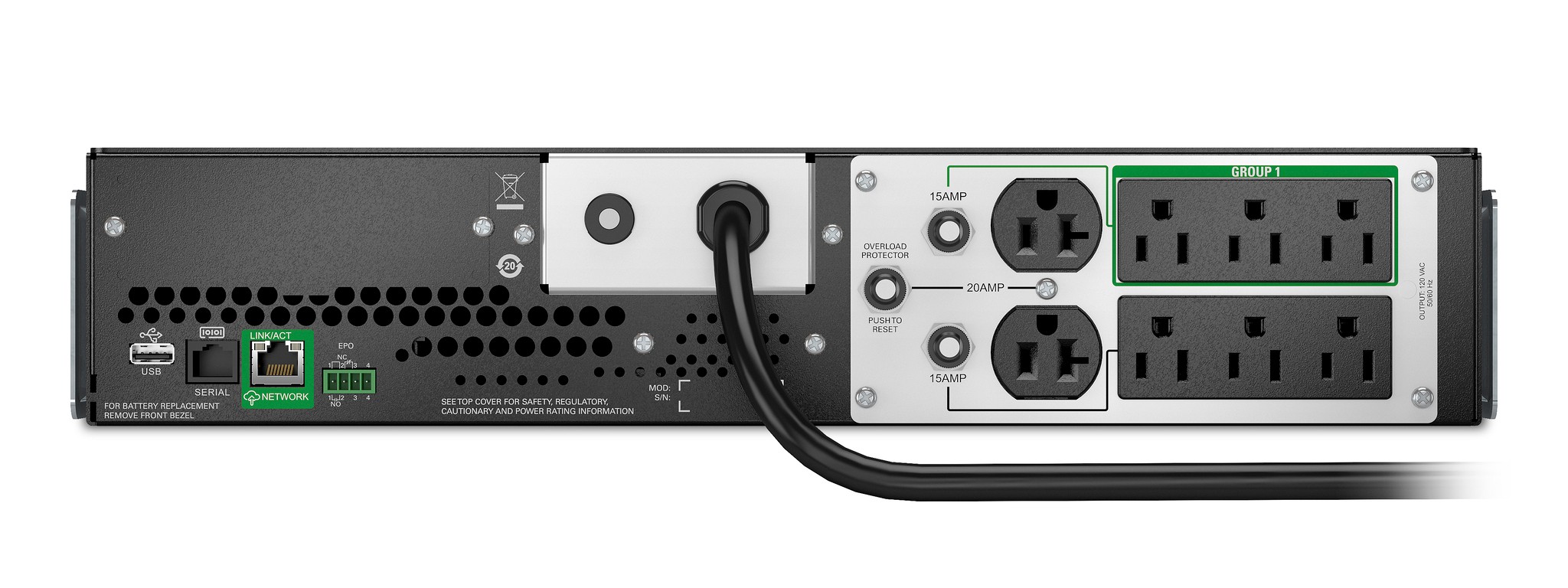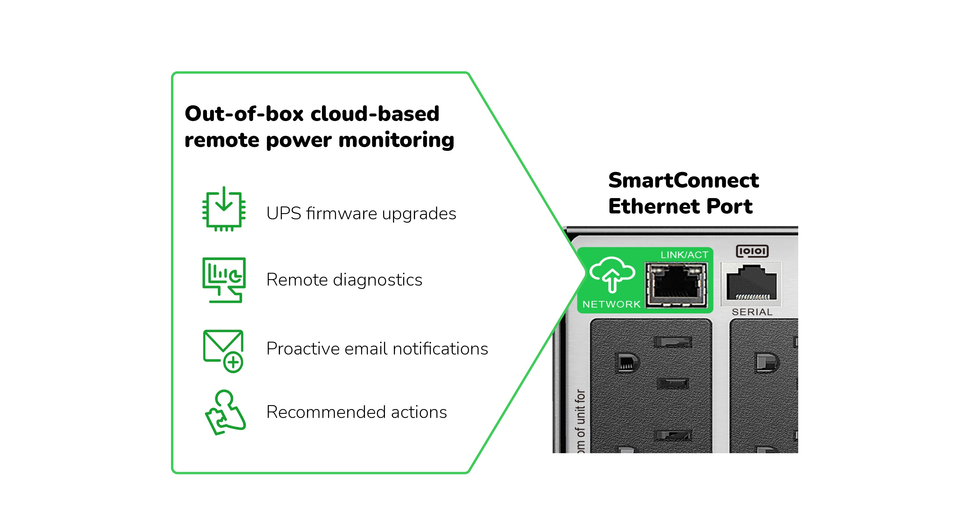 Built-in secure cloud monitoring with the EcoStruxure Ready Smart-UPS Ethernet Port. Network manageable via serial, USB or EcoStruxure™ Ready Smart Connect Ethernet Port. Includes