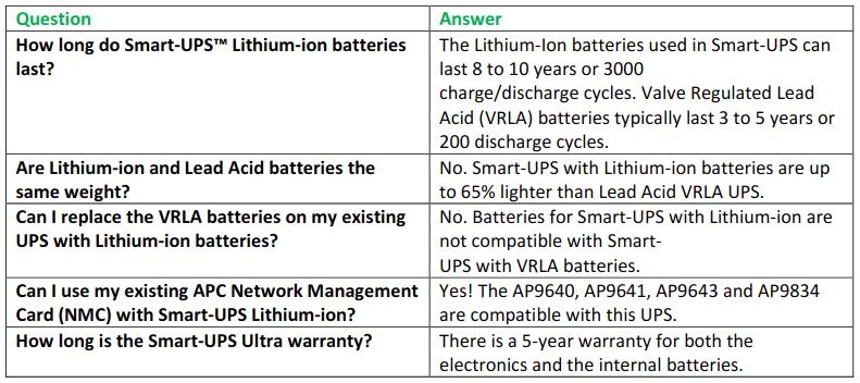 Smart-UPS Lithium-ion batteries last 3x longer than VRLA batteries. When you don’t have to replace the battery for 8-10 yearsas you would with a Lead Acid battery you save. Smart-UPS Lithium-ion UPS are up to 65% lighter making installation easier.