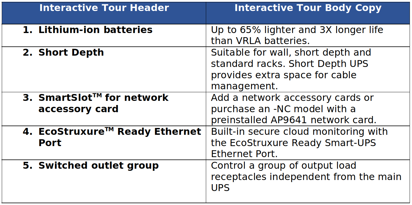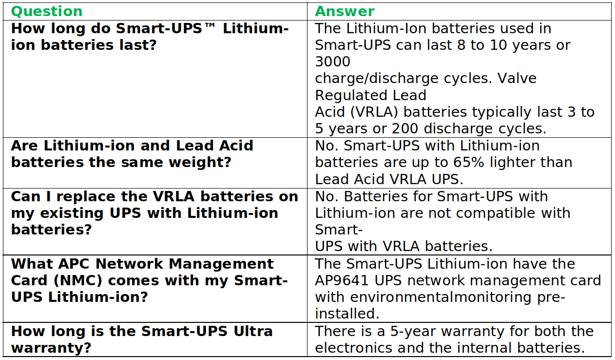 Smart-UPS Lithium-ion batteries last 3x longer than VRLA batteries. When you don’t have to replace the battery for 8-10 years as you would with a Lead Acid battery you save. Smart-UPS Lithium-ion UPS are up to 65% lighter making installation easier.