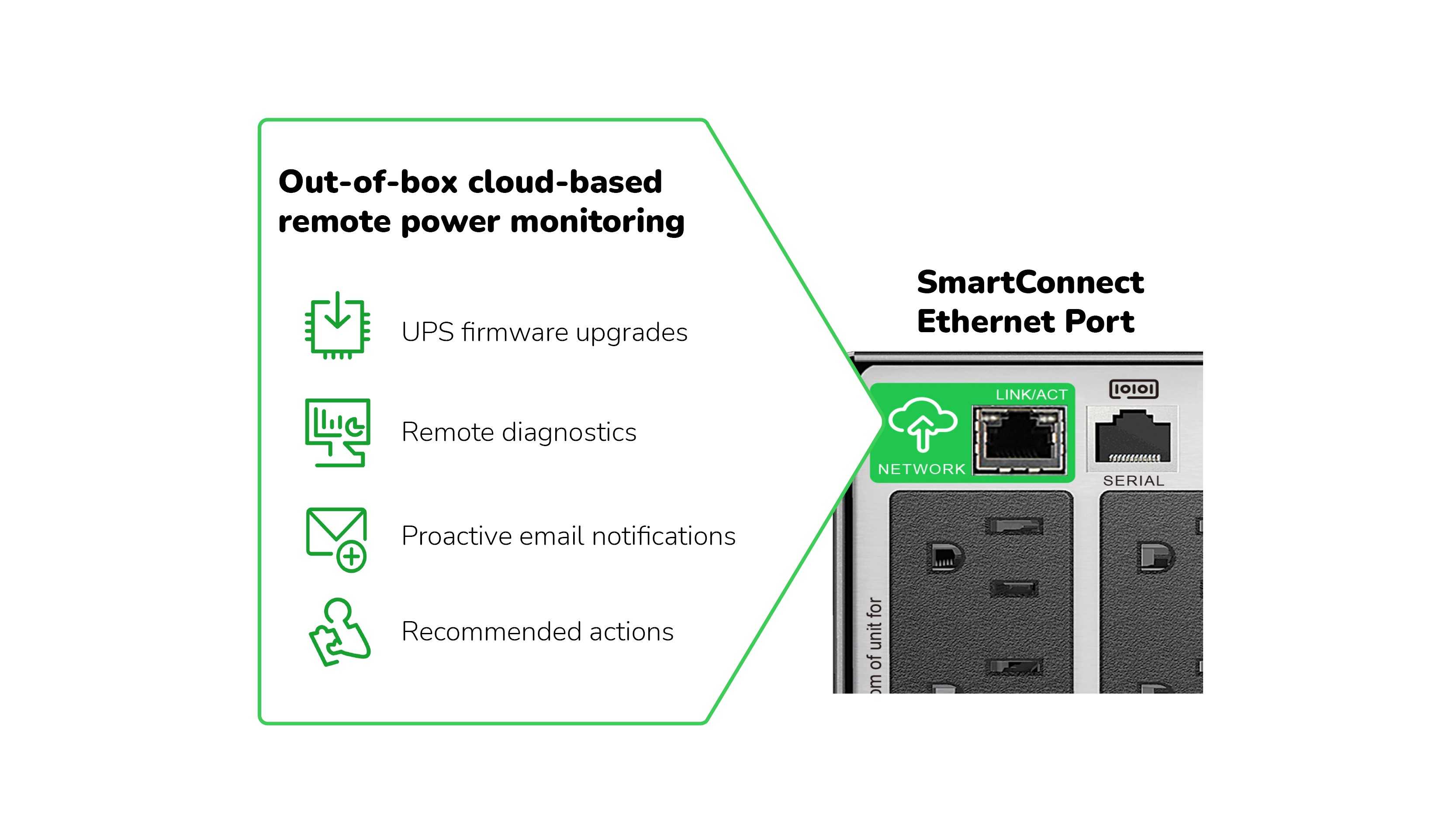 Built-in secure cloud monitoring with the EcoStruxure Ready Smart-UPS Ethernet Port. Network manageable via serial, USB or EcoStruxure™ Ready Smart Connect Ethernet Port. Includes
