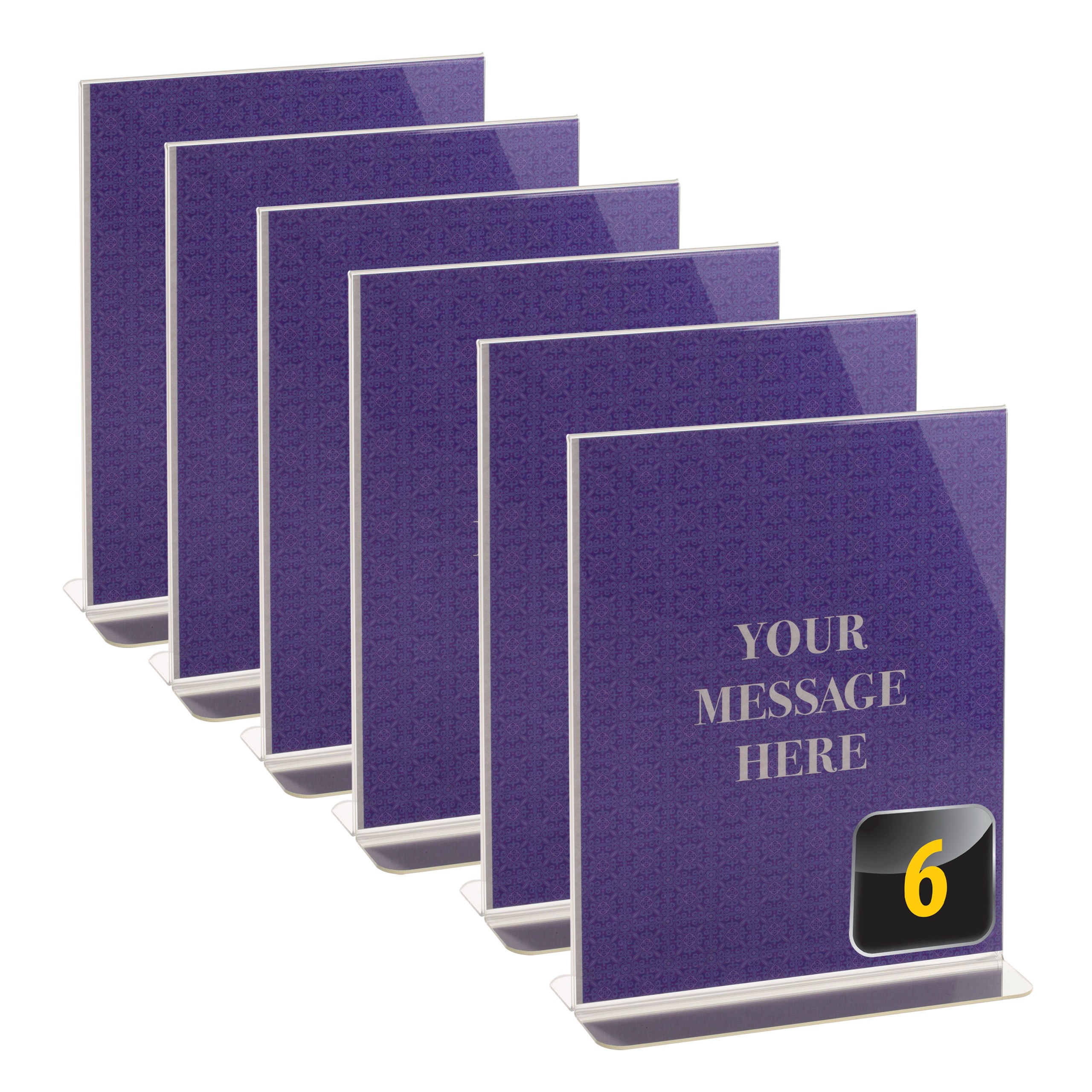 Self-standing 8½” x 11” upright dual-side sign holder. Pack of 6 clear plastic holders.