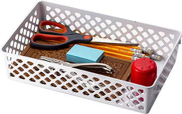 Handy office or home catch-all baskets for all kinds of supplies. 10 1/16” width x 6 1/8” depth x 2 3/8” height. White. Pack of 2.