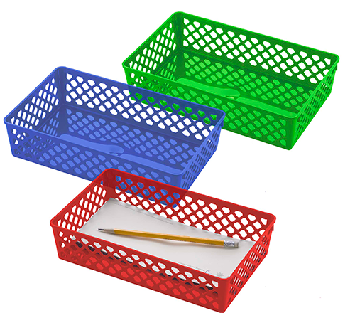 Large supply basket ideal for storing supplies, crafts, cosmetics, and more. Each basket measures 10 5/8” width x 6 1/8” depth x 2 3/8” height. Pack of 3. Comes in vibrant assorted colors: red, blue, and green.
