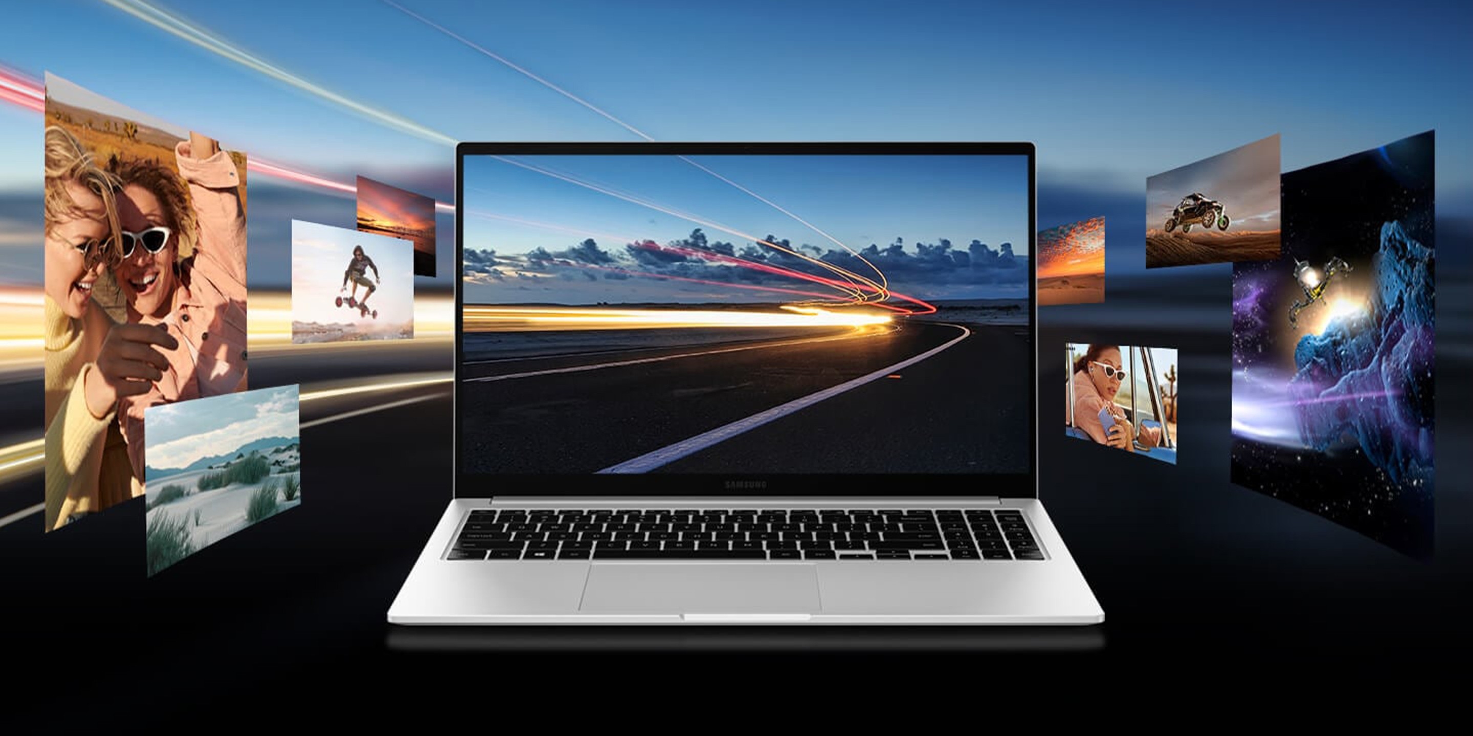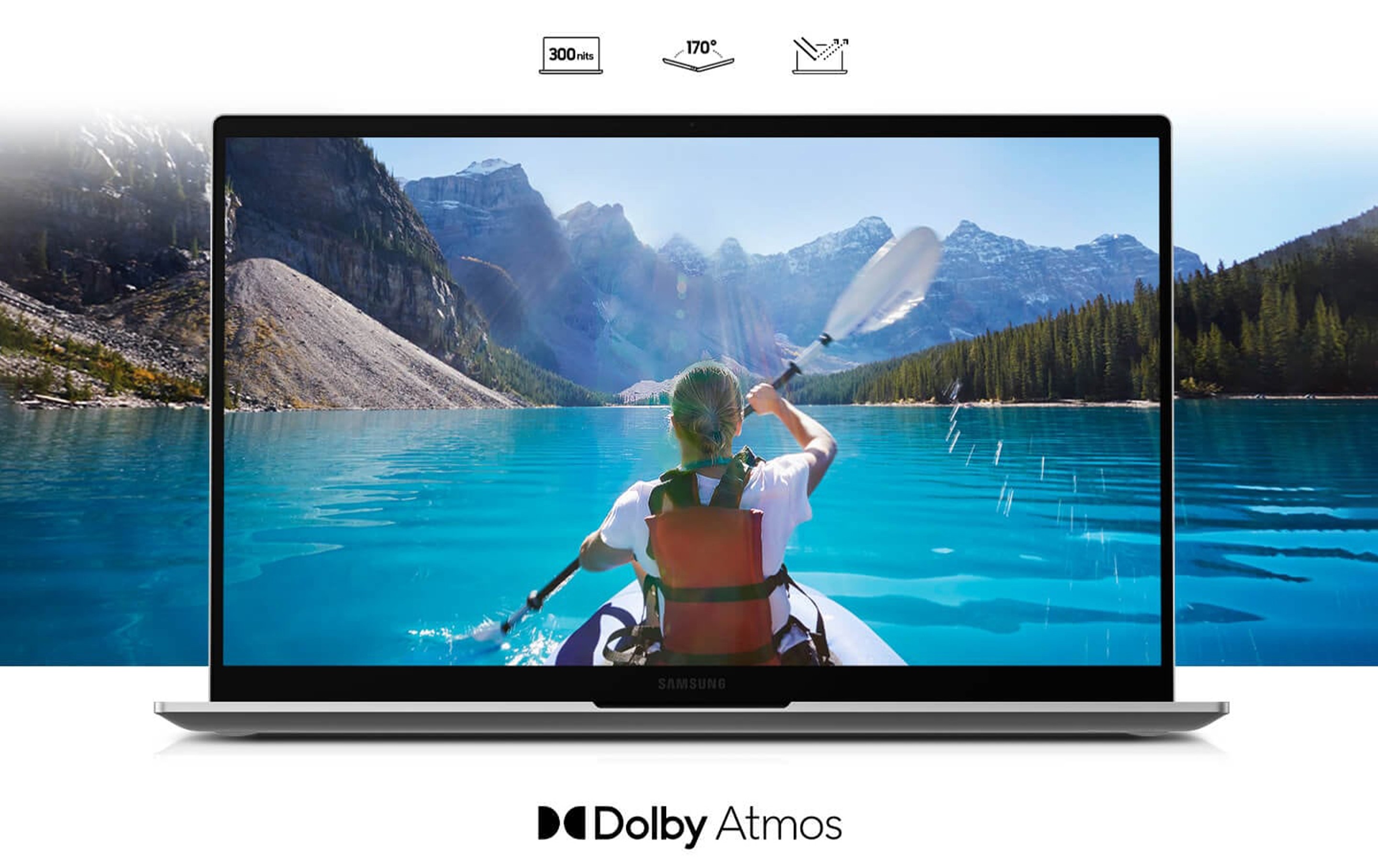 With the 15.6" FHD display and Dolby Atmos® sound, Galaxy Book delivers an immersive visual and audio experience. Slim bezels and a wide 170° viewing angle pull you in, while the bright 300-nit display includes anti-glare technology to keep your eyes comfortable.