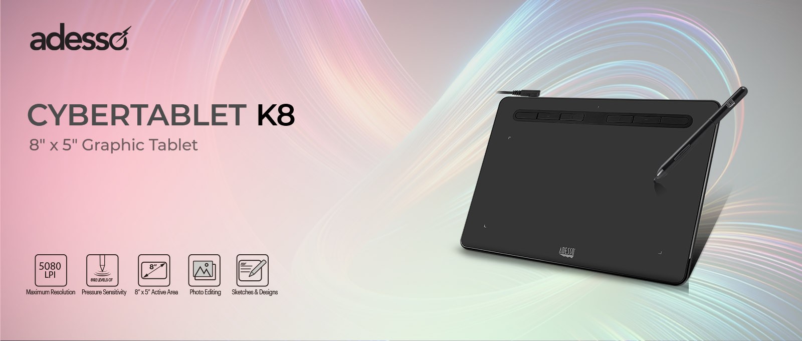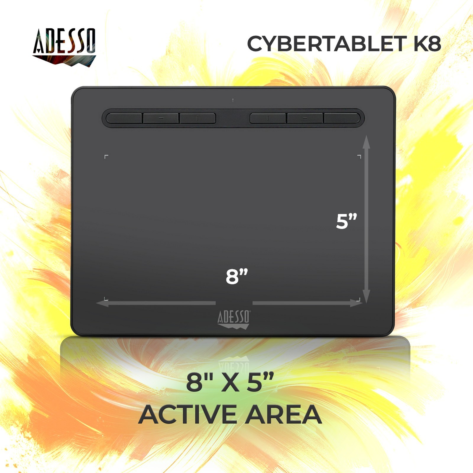 The Cybertablet K8 is an advanced graphic tablet that offers both PC and Mac users superior cursor control, greater productivity and higher efficiency. Perfect for art, business, presentations, and projects. The Cybertablet features 8192 levels of pressure sensitivity to imitate the subtleties of a brush stroke and other writing tools, while its multiple programmable hot keys provide various shortcuts to commonly used computer tasks. Plus, the drawing area allows increased precision and detail. This high quality graphic tablet is ideal for document annotation, free hand illustrations, graphic design, whiteboard presentations, or generally more precise cursor control.